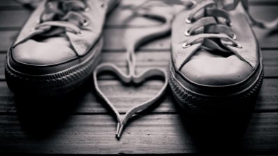 Pair of classic canvas sneakers arranged with their laces formed into a heart shape on a wooden surface